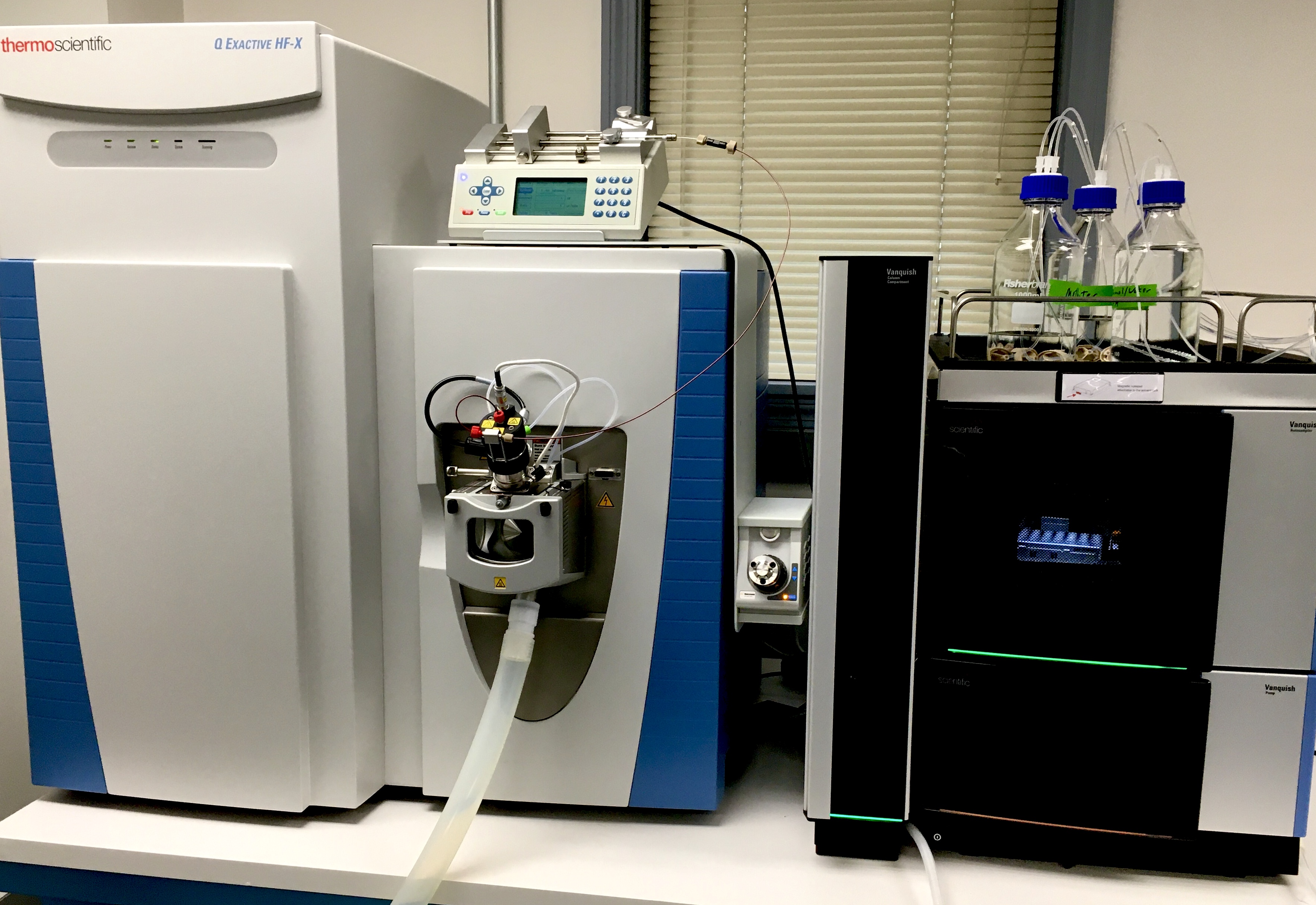 Thermo Scientific Q Exactive HF-X with Vanquish Flex UHPLC ~metabolomics profiling and targeted quantitation~ A quadrupole-Orbitrap hybrid mass spectrometer employing HCD fragmentation and conventional flow UHPLC. Metabolomics applications include untargeted metabolomic and lipidomic profiling and targeted assays. |