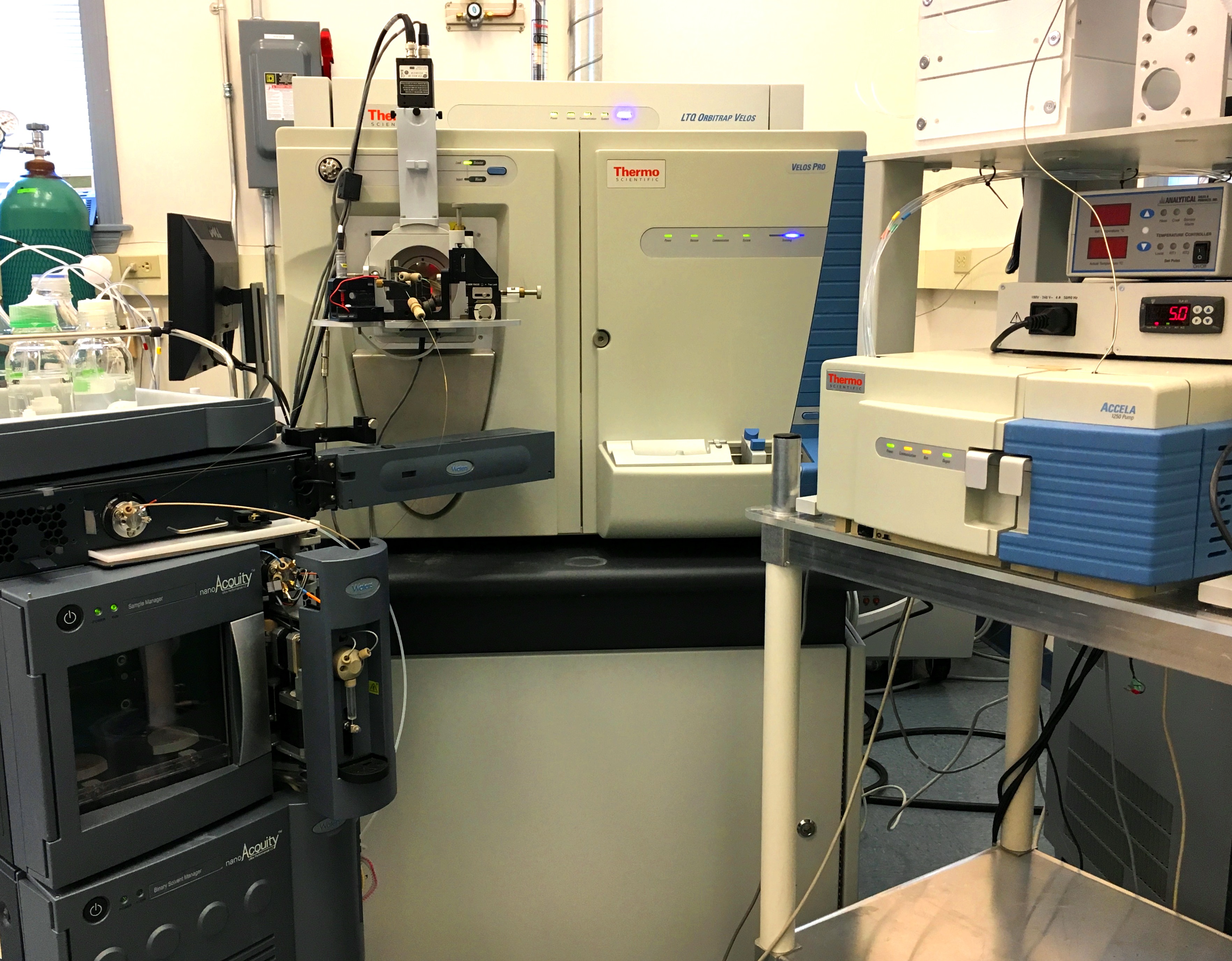 Thermo Scientific Orbitrap Velos Pro with Accela 1250 UHPLC or Waters NanoAcquity UPLC A linear ion trap-Orbitrap hybrid mass spectrometer employing CID, HCD, and ETD fragmentation. Untargeted metabolomic and lipidomic profiling and targeted assays using HCD fragmentation using conventional flow UHPLC. Nanoflow UPLC for high-sensitivity applications including neuroactive steroids, modified nucleotides, and peptides. |