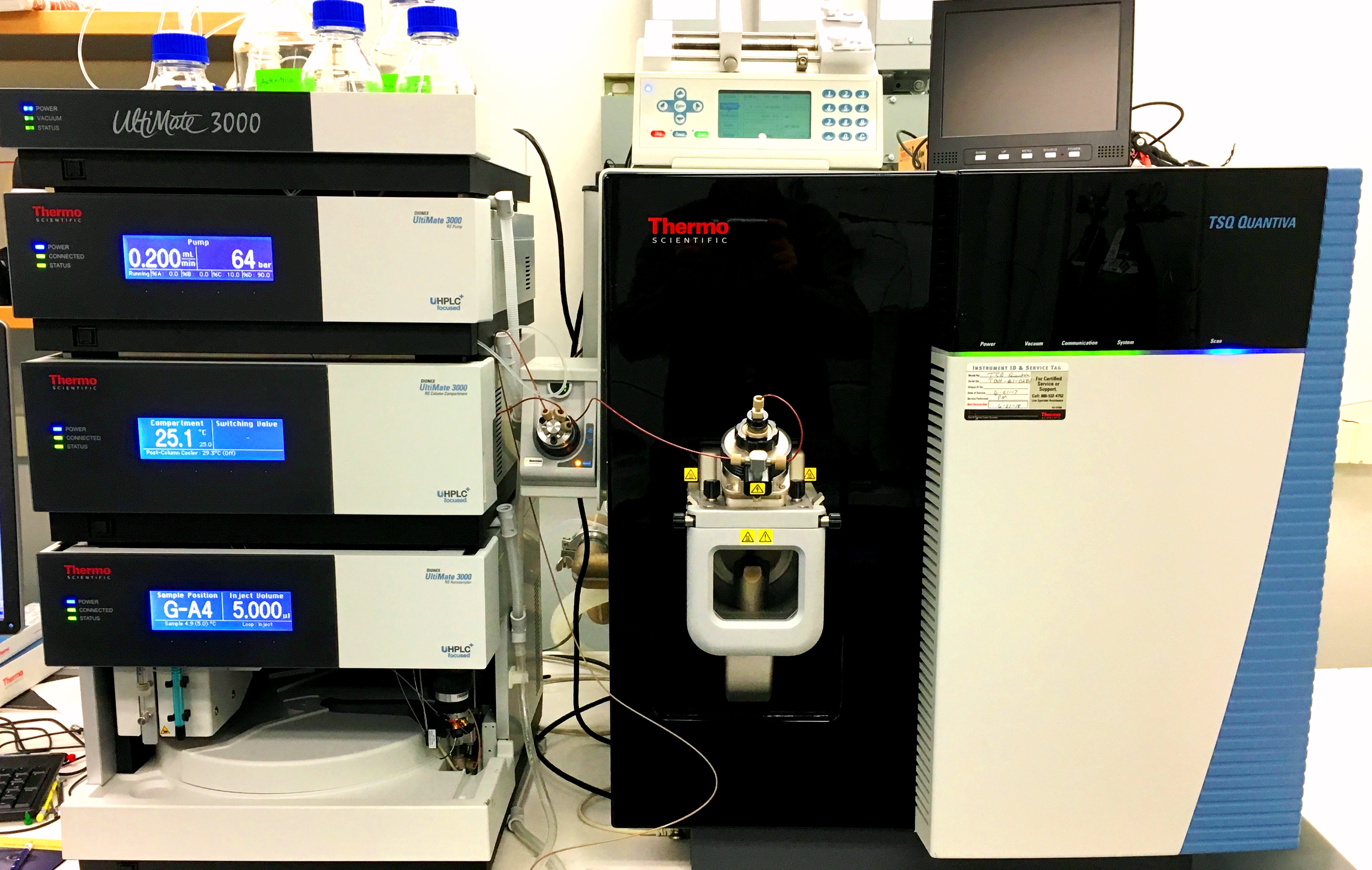 Thermo Scientific TSQ Quantiva with Dionex UltiMate 3000 UHPLC ~targeted metabolomics~ A triple quadrupole mass spectrometer for targeted metabolomics and small molecule quantitation using conventional flow UHPLC. A Proxeon EasyLC is also available for nanoflow applications. |