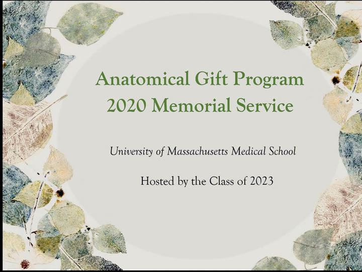 The 2020 Anatomical Gift Program Memorial Service took place on September 26 after being postponed due to COVID-19 restrictions. These year's service took place via Zoom with medical students from the Class of 2023 participating with readings, music, poetry and recognition of the donors. Students, families and staff were sad not to have a memorial service at the medical school but happy to be able to host a virtual service.