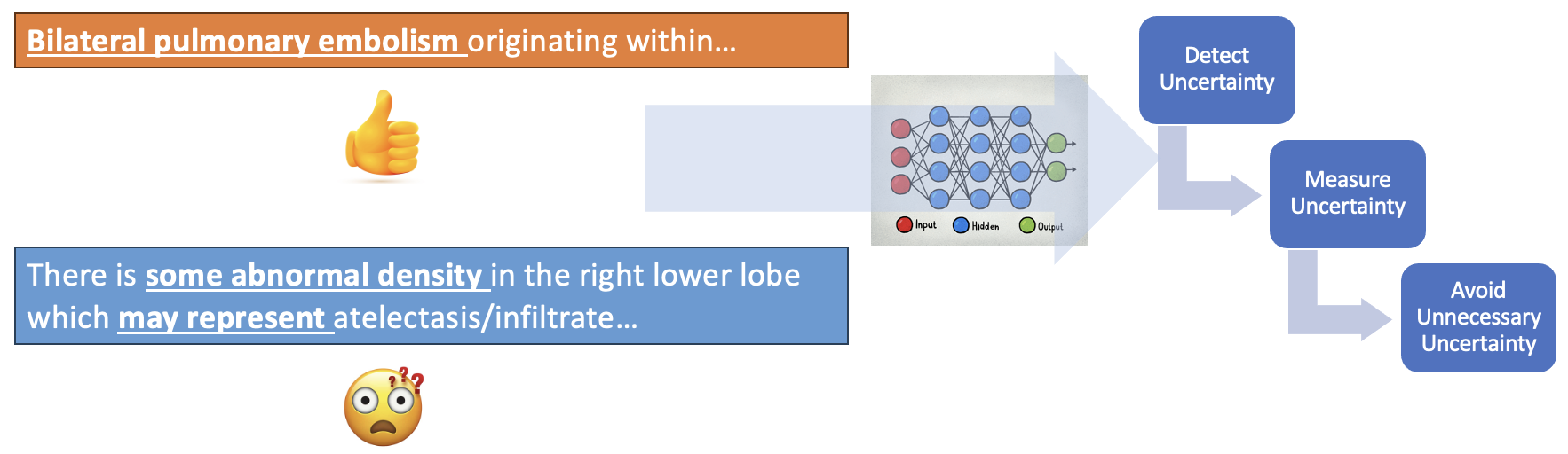 | This project aims to develop a deep learning-based approach for context-aware (un)certainty assessment (DeepCertainty), which is end-to-end trainable, calibratable, generalizable, scalable, and explainable. It would allow for fine-grained uncertainty measurement and standardization, facilitate consistent and accurate diagnostic certainty communication in CTPA reports and thus improve PE care. This study will build the foundation for future implementation and integration of DeepCertainty into clinical workflows to prompt real-time low-certainty alerts for improving PE diagnostic reporting quality and clarity, which will inform better treatment decisions for ED patients with suspected PE. |