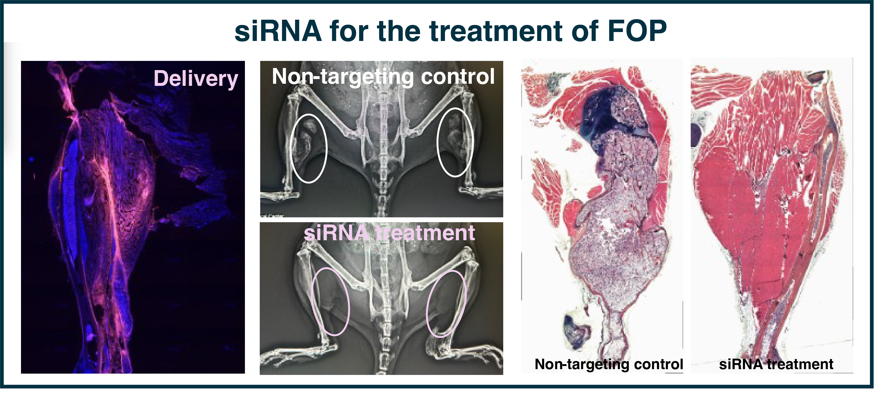 Our lab is also very interested in applying this technology to diseases of muscle and connective tissue. We are collaborating with the Jae-Hyuck Shim Lab in the Department of Genetic and Cellular Medicine to develop multi-functional siRNAs to suppress trauma-induced heterotopic ossification in fibrodysplasia ossificans progressiva (FOP). FOP is a devastating rare disease caused by an autosomal dominant mutation in ACVR1. Infividuals with this mutation experience aberrant bone growth following injury and inflammation to the muscle and connective tissue. We have developed a combinatorial siRNA treatment targeting the mutant ACVR1 receptor and an inflammatory target that significantly reduce bone growth after injury in a mouse model of FOP.
