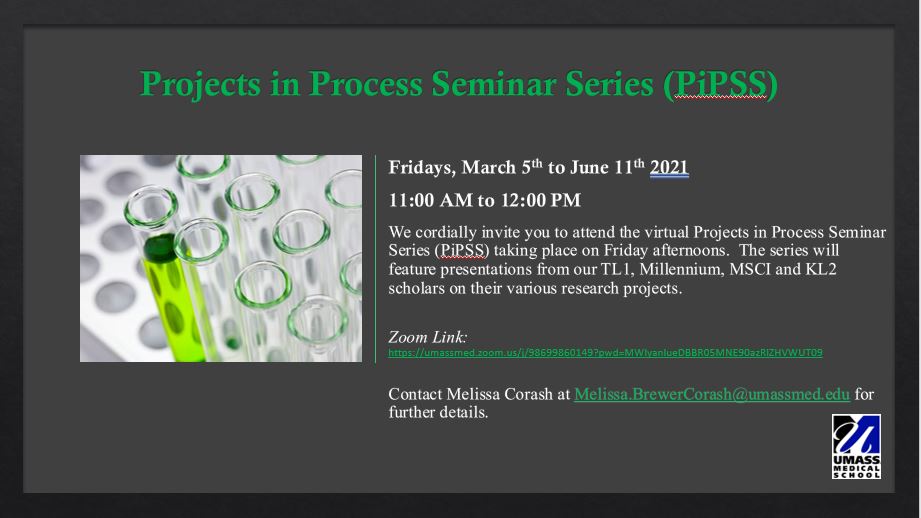 NEW Zoom Link: https://umassmed.zoom.us/j/93616067722?pwd=eHhKZ0h0djNWQlkwbnZSMmtUWEw5UT09 C Passcode: 003718 We cordially invite you to attend the virtual Projects in Process Seminar Series (PiPSS) taking place on Friday afternoons. The series will feature presentations from our TL1, Millennium, MSCI and KL2 scholars on their various research projects.Wednesday, June 9, 2021