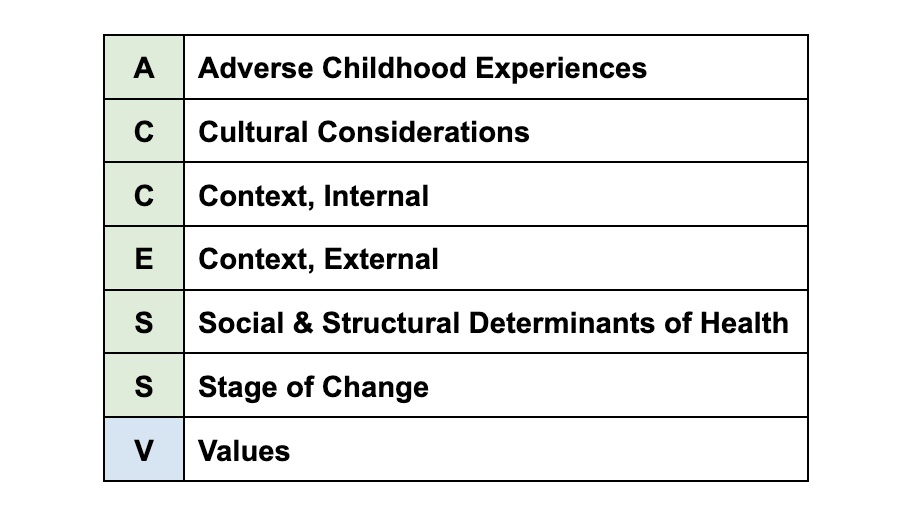 Connecting ACCESS-V mnemonic to the core structure of the Contextual Interview (Work, Love, Play, Health Behaviors) gives learners a clear anchor in what they are listening for during the Contextual Interview, with a focus on synthesizing and applying this information in real-time so that healthcare is delivered in a context-sensitive way.