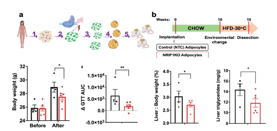 (Figure Description) Implantation of NRIP1/RIP140-targeted human adipocytes decreases body weight and liver triglyceride and enhances glucose tolerance in recipient HFD-fed NSG mice. Mice were implanted with either human adipocytes previously treated with NTC (non-targeting control) sgRNA/Cas9 RNPs or with sgRNA-H5/Cas9 RNPs (NRIP1KO). a. Study Description: (1) adipose tissue isolation from a human donor during panniculectomy, (2) harvesting of human primary preadipocytes after Cas9/sgRNA RNPs were delivered into the human preadipocytes by electroporation followed by (3) expansion 1:6 of the genetically modified preadipocytes and (4) their differentiation into mature adipocytes; (5) Implantation of non-targeted control (NTC) sgRNA treated adipocytes versus the NRIP1 depleted adipocytes was performed in the dorsal area of NSG mice. b. Schematic protocol of implantation of human NTC adipocytes or NRIP1KO adipocytes into NSG mice followed by HFD feeding. Lower panel bar graphs: Body weight, change in glucose tolerance test area under curve due to HFD feeding, liver to body weight ratio, and liver triglyceride measurements in mice implanted with NTC human adipocytes (black bars) vs with Nrip1KO human adipocytes.