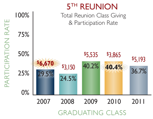 Below are graphics illustrating the giving totals and participation rates for the Classes of 1974 to 2011 by reunion year; the top numbers for fundraising and participation are highlighted. (Click on a reunion year to see graphic.)