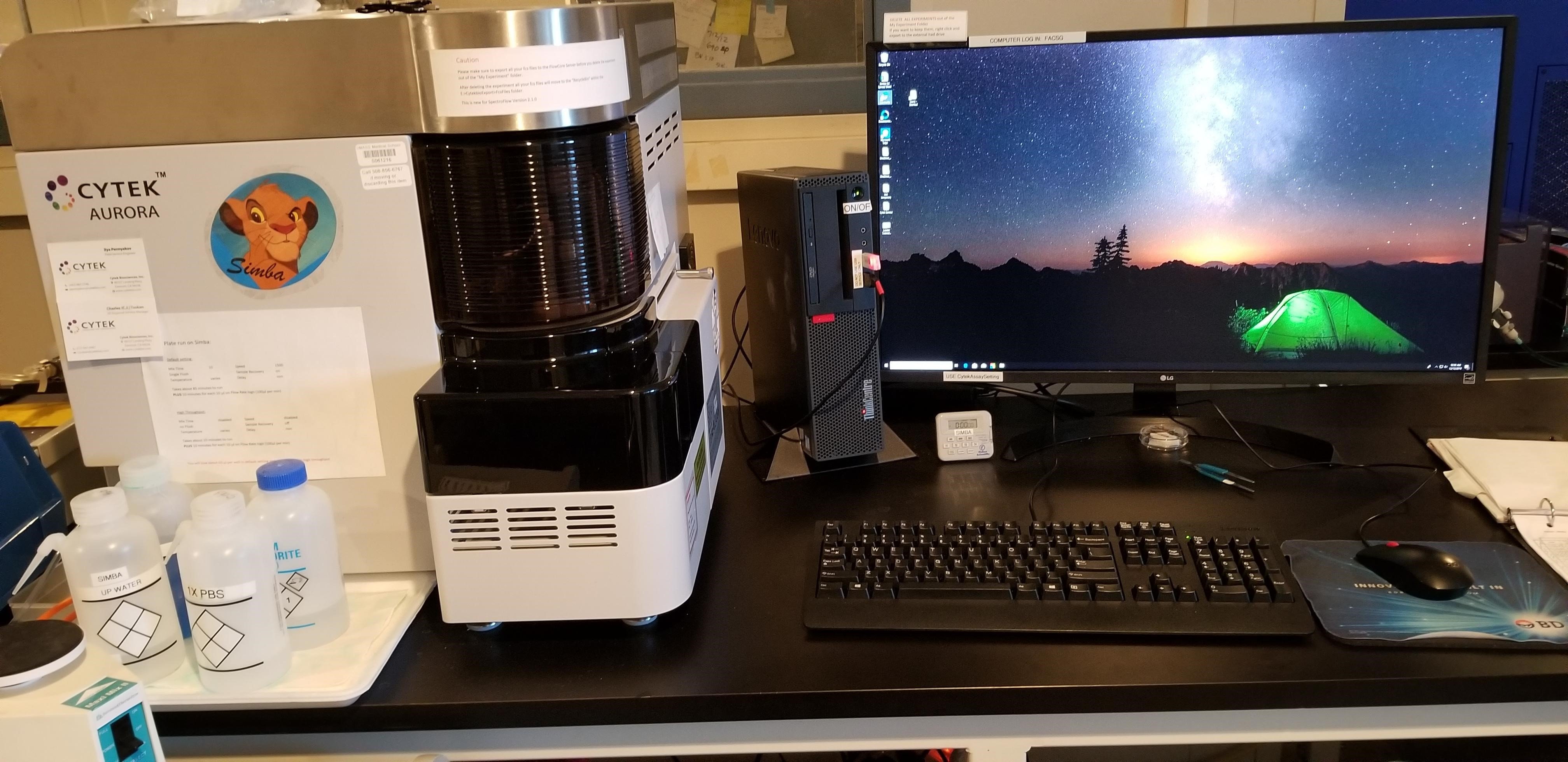 The Cytek Auroras use spectral analysis to allow separation of fluorochromes with very close emission profiles. All 3 Auroras are equipped with 16 UV, 16 Violet, 14 blue, 10 yellow-green and 8 red channels and two scattering channels. The Aurora’s optical design enables the use of a wide array of new fluorochrome combinations without reconfiguring the system for each application. One instrument (Simba) is located in S5-322 and includes a plate loader with mixing and temperature control. A second instrument (Nala) is located in LRB 357, together with the third Aurora equipped with a tube and plate sampler.