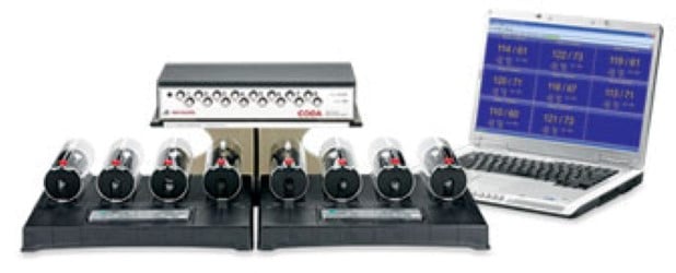 The CODA measures blood pressure in multiple mice or rats simultaneously. Using Volume Pressure Recording (VPR) to measure the blood pressure by determining the tail blood volume. A specially designed pressure transducer and occlusion tail-cuff measures the total blood volume in the tail. The CODA system provides six different blood pressure parameter measurements; heart rate, tail blood flow, tail blood volume, systolic and diastolic blood pressure and the mean pressure. Measurement acquisition can be done on anesthetized or conceous study animals. and can obtain readings on dark-skinned rodents, such as C57BL6 mice.