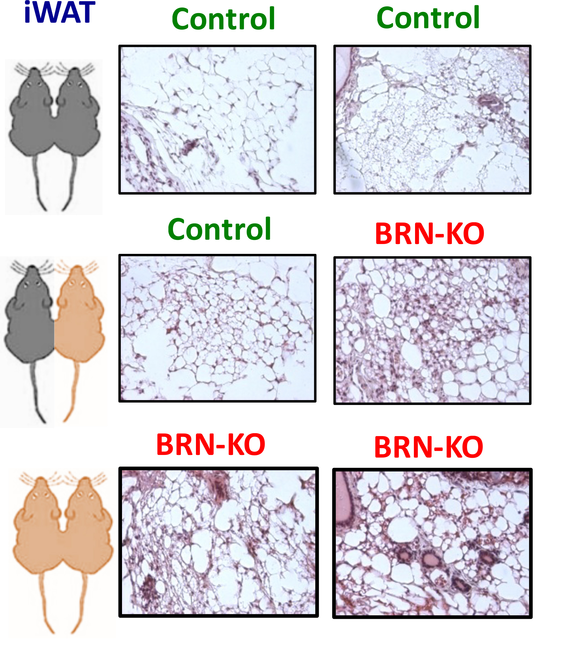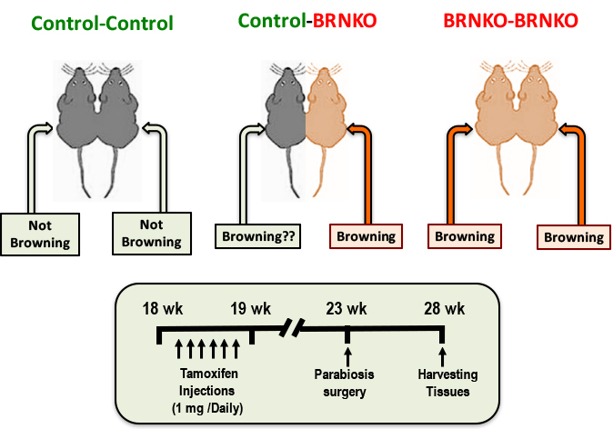 Schematic representation of parabiosis methods with Brown Adipose KO mice. Assessment whether deletion of KO in