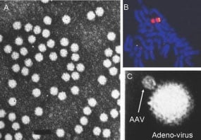 AAV is a non-pathogenic human parvovirus which is commonly isolated from the respiratory tract of humans (Figure 1A). AAV’s life cycle includes a unique mechanism for persistence in human cells by means of site-specific integration into a region of chromosome 19, the AAVS1 site (Figure 1B).