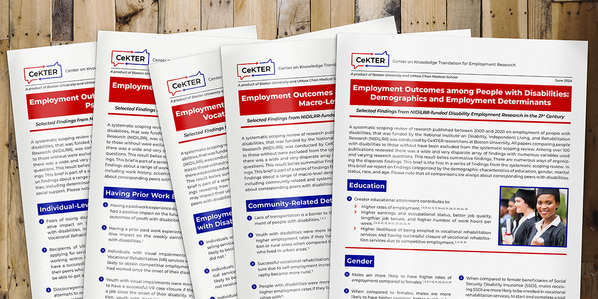 These briefs are part of a series of findings from a systematic scoping review of research published between 2000 and 2020 on the employment of people with disabilities developed by Zlatka Russinova, PhD, and team.