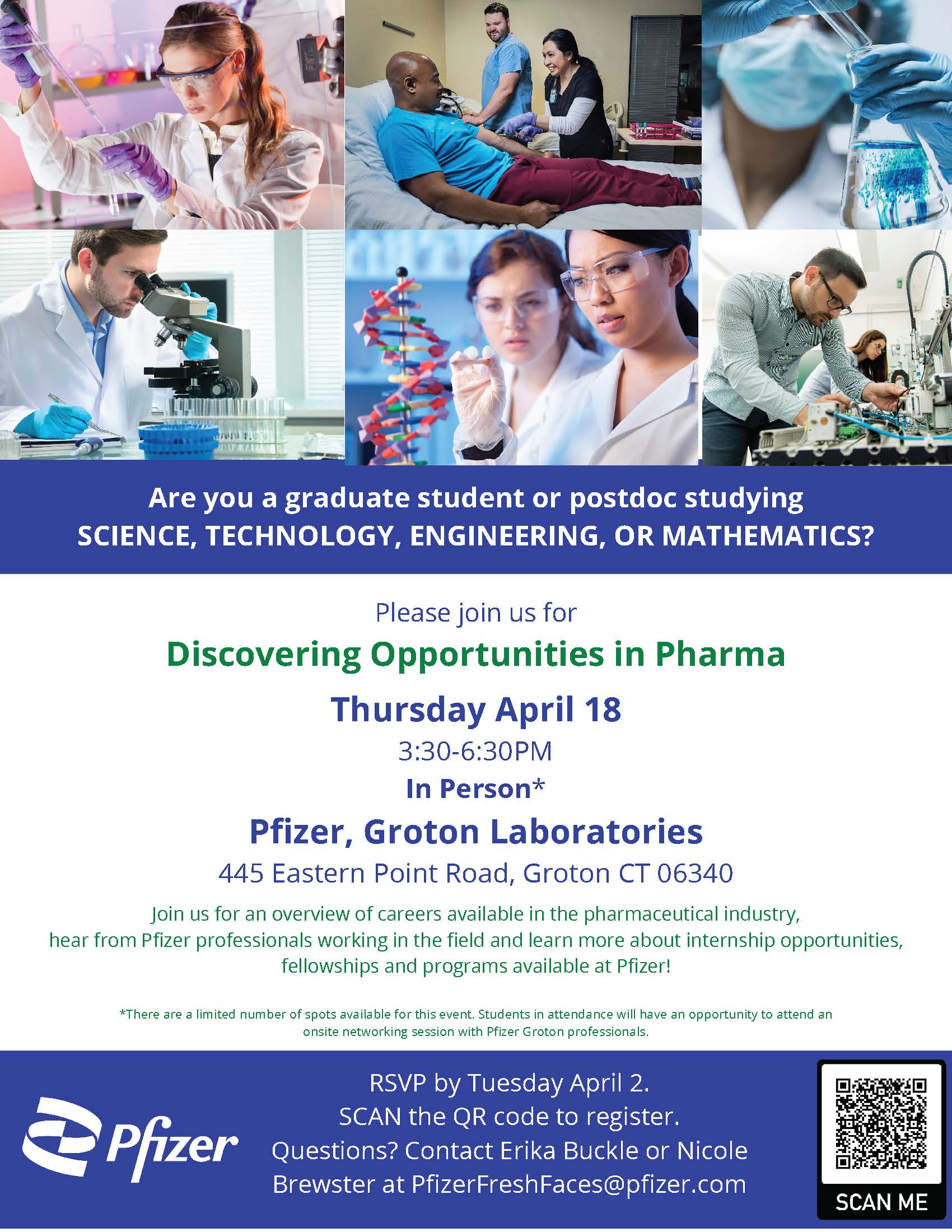 IndEx is thrilled to announce our second pharma company site event this month! Hosted by Pfizer R&D center in Groton, CT, join us for an insightful overview of career opportunities within the pharmaceutical industry. Gain valuable insights from Pfizer professionals actively engaged in the field and discover internship opportunities, fellowships, and programs offered by Pfizer. This event is open to multiple universities, offering ample opportunities to learn about Pfizer, network with peers, and connect with industry professionals. Register for the event by scanning the QR code on the flyer. Registration deadline is April 2nd. Please note that registration is managed by Pfizer, and spots for this event are limited. Looking for a ride or willing to offer one? Click here to access our volunteered carpool form. Cheers |