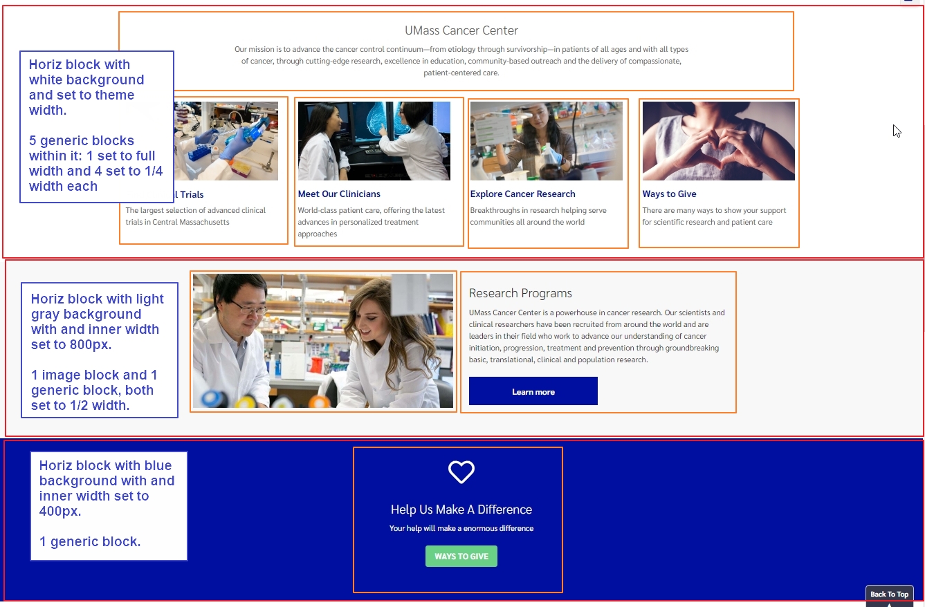 This block is a container for other blocks which allows you to set a background color that extends the full width of the browser. This can be used to help break up the layout and highlight your information. While this block has no text areas itself, you drop other blocks within it. You can drop 1 or many and set the columns widths on each block. You can also set the width of the block area to extend the full width, the theme width as to align with other content on the page, or a width that you can set. Some examples are shown farther below.