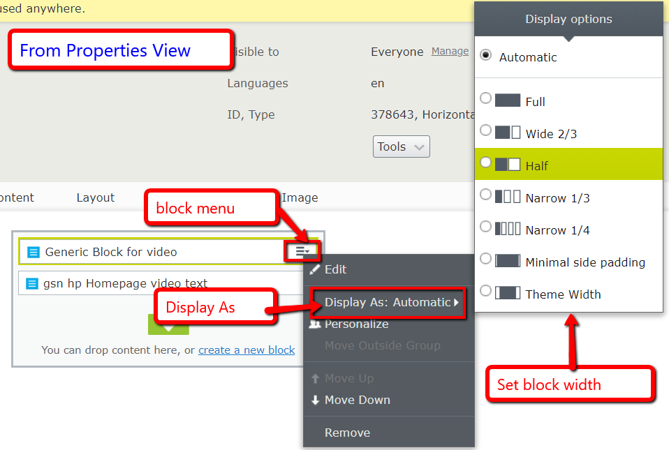 You can adjust the column widths of your blocks in layout (preview) view or properties view. The default setting, if unset, will be Automatic which is the same as Full.