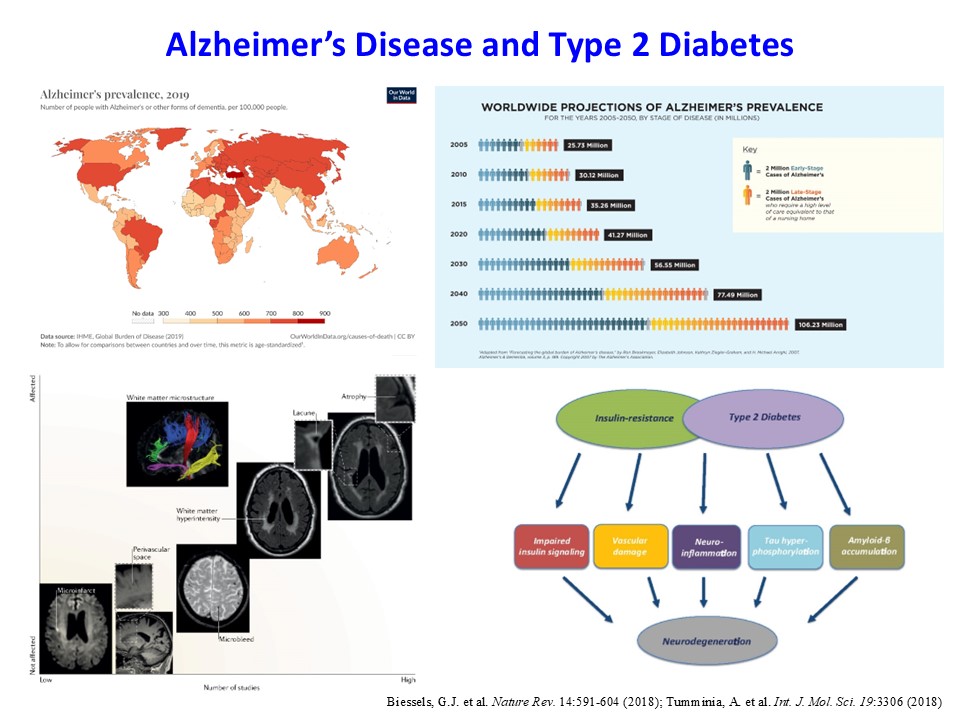 As a key risk factor for Alzheimer’s disease (AD), aging induces a biological modification of cells affecting multiple organ systems through complex pathways that are unresolved. Interestingly, insulin resistance, a major characteristic of obesity that increases with aging, is a common shared feature in AD and metabolic diseases. Indeed, recent studies have alluded to a possible connection between peripheral insulin resistance and neurodegeneration, but this connection remains poorly defined. A key feature driving insulin resistance is inflammation, as metabolic organs are infiltrated by macrophages, releasing pro-inflammatory cytokines that impair insulin signaling and glucose metabolism. Intriguingly, increased pro-inflammatory molecules and microglia, as brain-resident macrophages, are also characteristic of the AD brain. Thus, our goal is to delineate whether changes in peripheral metabolism and inflammation are mechanistically linked to similar changes and neurodegeneration in the AD brain.