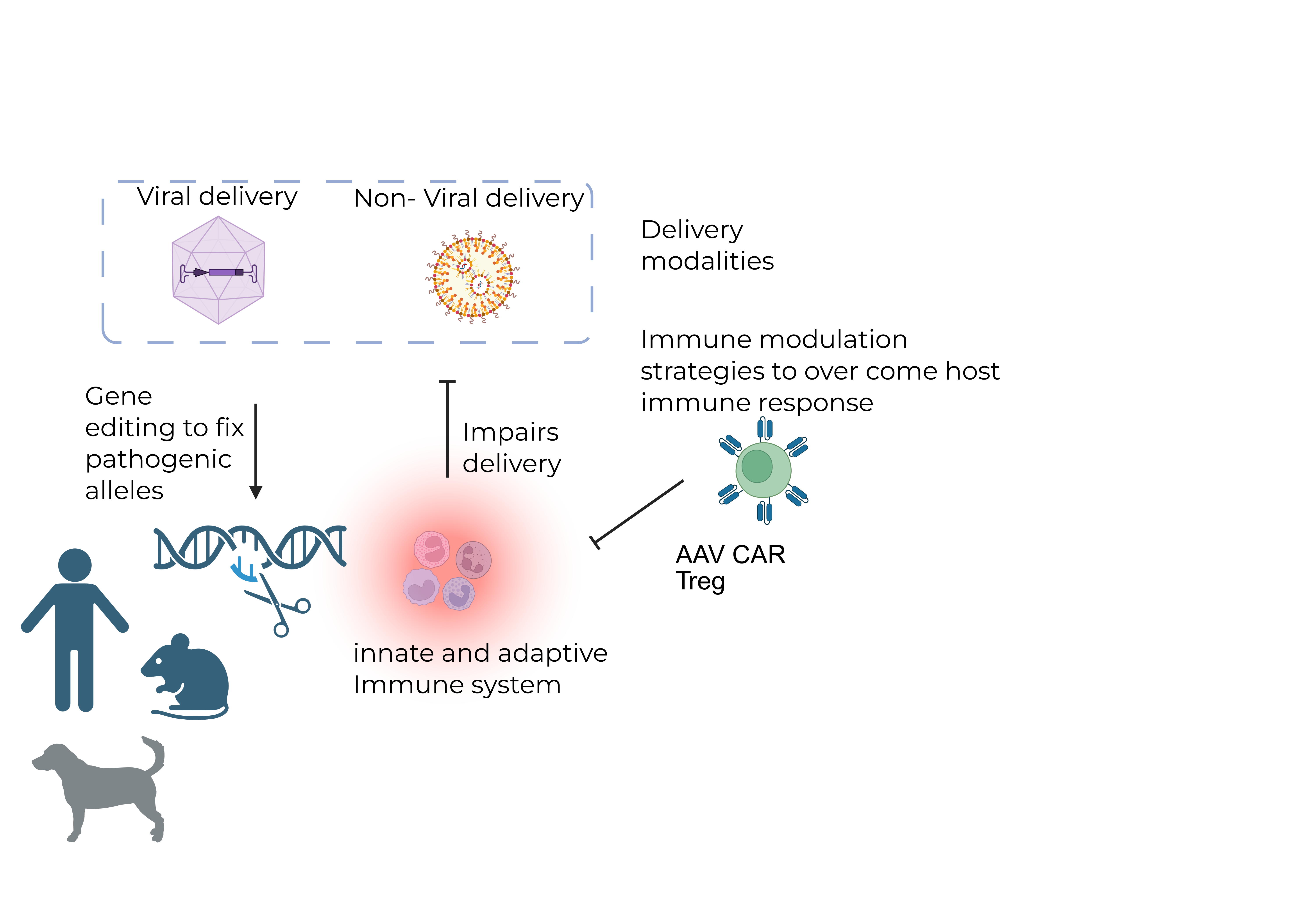 In our lab, we are exploring the immune response to Cas9 nucleases, delivered either with Adeno Associated Viruses (AAVs) or lipid nanoparticles (LNPs). We are also interested in exploring immune modulating strategies to overcome host immune responses against gene editing reagents delivered using viral and non-viral modalities.