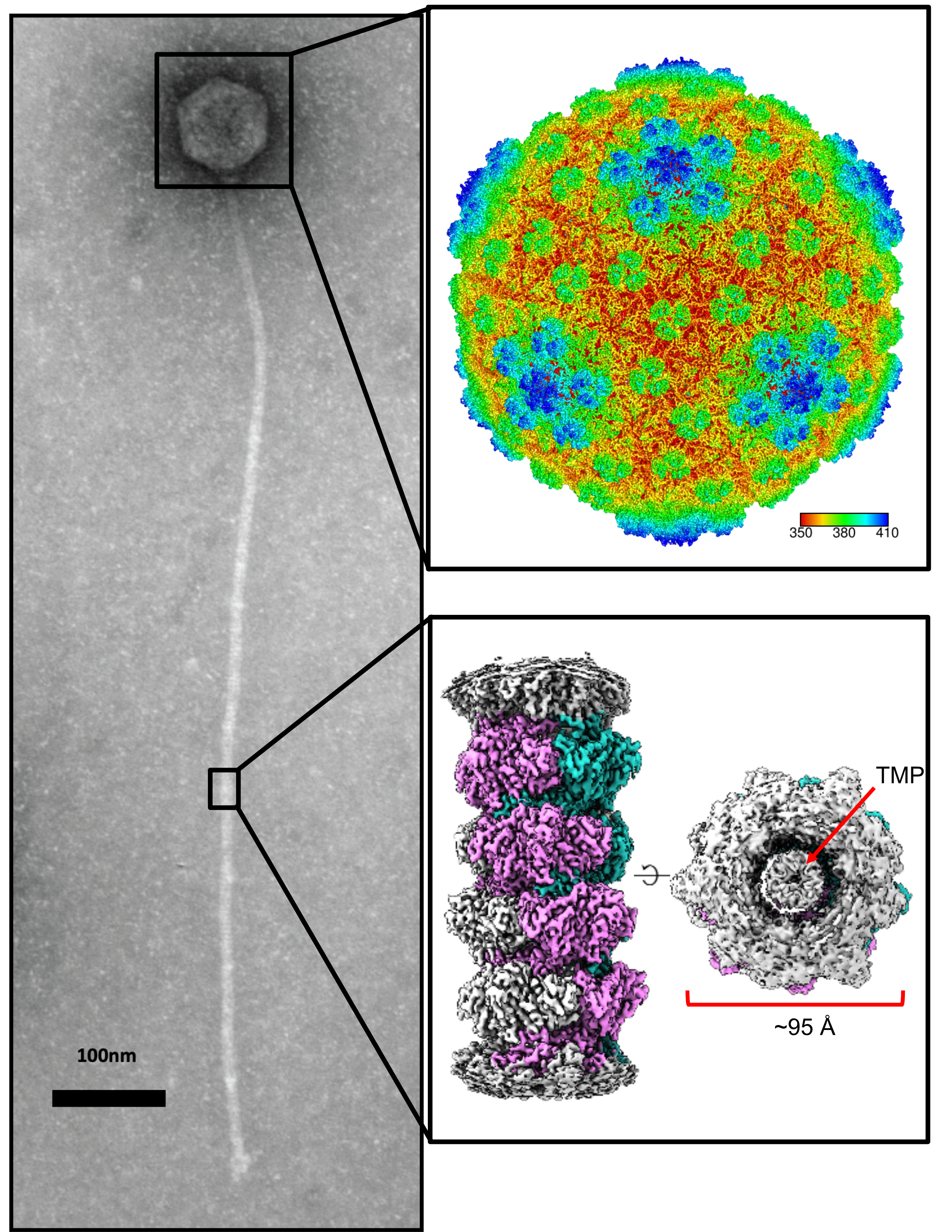 Most known bacteriophage are dsDNA viruses that have protein-shelled capsid that holds the viral genome, and a tail that acts as a conduit to inject that DNA into the host cell. We are interested in the mechanism and properties of these self-assembling systems. Recently, we have investigated self-assembly using the thermophilic phage P74-26, as it is the most thermo-stable known phage. We have determined that the capsid uses an interweaving network of interactions to create an ultra-stable shell (Stone et al Structure 2018 & Stone et al Nat Comm. 2019). We also have taken advantage of the long tail of P74-26 (at nearly 1µm, it is the longest known phage) to investigate the mechanism of tail formation. We have derived a simple structural model that describes a series of auto-inhibitory interactions that regulate the nucleation of tail tubes (Agnello et al JBC 2023; see story in ASBMB Today here). We have also determined the structure of the head-to-tail connection (aka the Neck), which revealed a mechanism for phage to sense pressure during the switch from genome packaging to tail attachment (Sedivy et al biorxiv 2025).