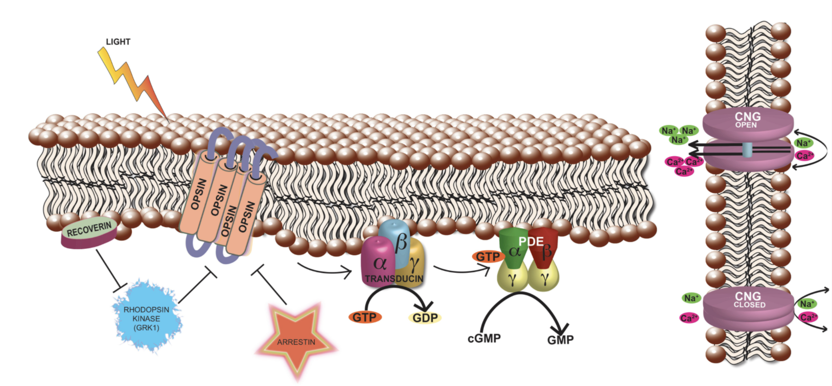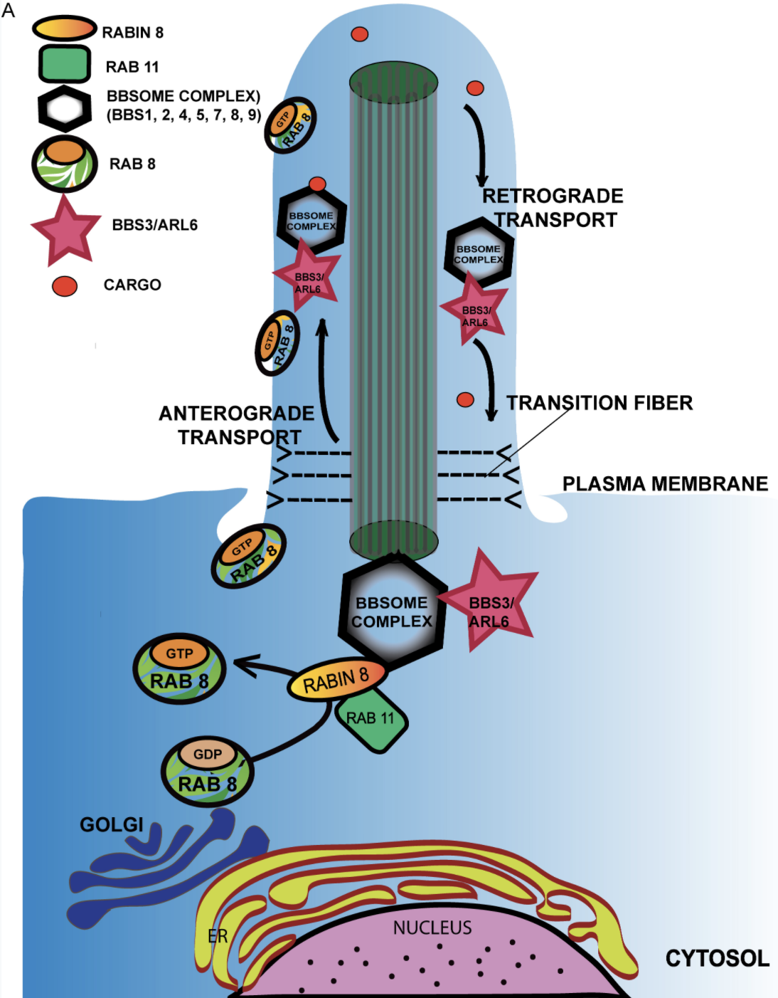 Photoreceptors are highly polarized and metabolically active neurons with a distinct compartment, called the OS, to house the phototransduction machinery. The OS is a modified sensory cilium, which contains membranous discs arranged in a coin-stack like fashion. This elegantly complex structure is devoid of any protein translation machinery; hence, the components that populate the OS are synthesized in the inner segment (IS), which contains all the necessary organelles, including the endoplasmic reticulum (ER), Golgi, and mitochondria, and transported to the distal OS. Distal to the inner segment is the cell body containing the nucleus and synaptic termini that extend into the outer plexiform layer where they synapse with the second-order neurons called bipolar cells.