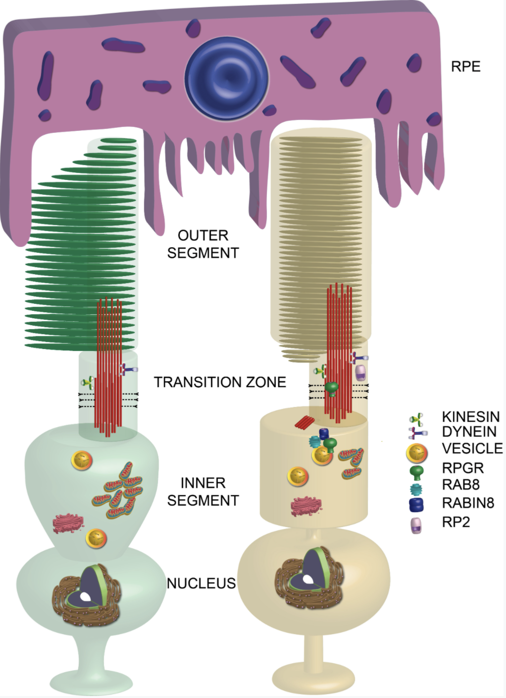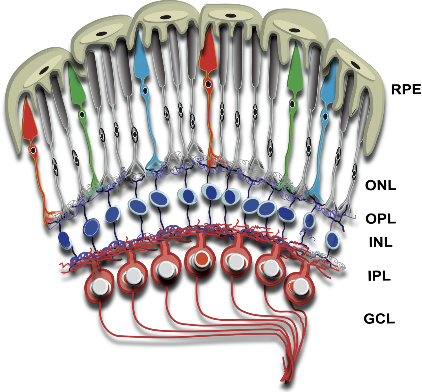 The retina is ~0.5 mm thick tissue situated in the back of the eye and is involved in the first steps of light sensation. It is a highly organized tissue consisting of six major types of neurons and one glial cell type separated by two synaptic layers, called the outer and the inner plexiform layers. Among the neurons, photoreceptors are the most abundant cell types and form the outermost layer of the retina. The tips of the photoreceptors are physically closest to the retinal pigment epithelium (RPE), which forms the outermost blood-retina barrier and is also involved in the visual cycle and periodic maintenance of the photoreceptor sensory compartment. The choroidal blood vessels overlying the RPE supply nutrients to photoreceptors.