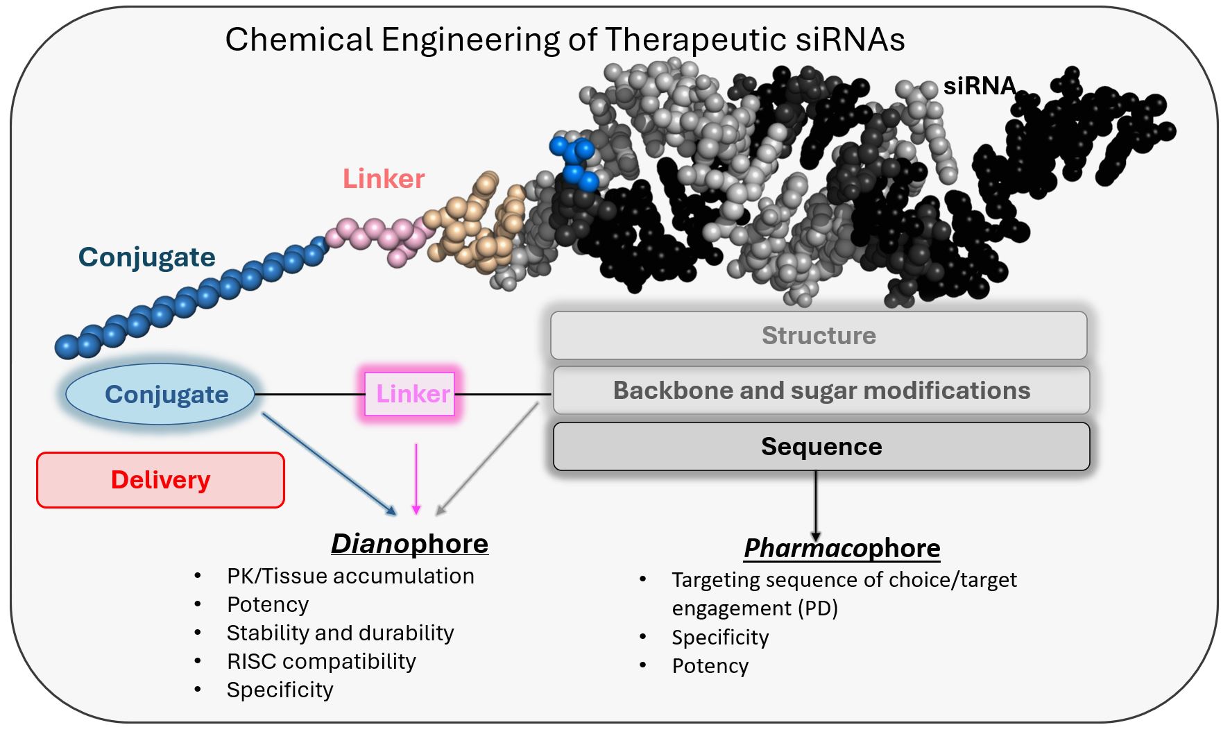 Our lab advances the fundamental chemistry of siRNAs to optimize their therapeutic performance. We explore novel backbones and chemical modifications that modulate interactions with Argonaut protein, particularly the PAZ and MID domains, with the goal of improving therapeutic efficacy. We are especially focused on how physicochemical properties—such as size, structure, shape, stability, and lipophilicity—affect siRNA pharmacology.