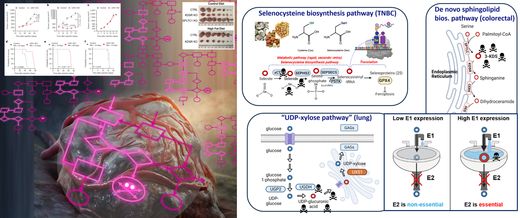 Our studies on toxic metabolites have allowed us to develop a unique, novel approach to selectively kill cells in an algorithm-based manner: by identifying the pathways that are hyperactivated in cancer that also happen to produce toxic metabolites, and targeting the detoxifying enzyme, we uncover novel cancer targets for which we are developing drug inhibitors. Furthermore, we can adjust the toxicity through dietary modulation of the upstream metabolites that feed into toxic metabolite production, and even gain further cancer selectivity when these nutrients are selectively uptaken by cancer cells. We have uncovered novel targets, and strategies to further ‘game the system’ to our advantage via dietary modulation, for breast, lung, and colorectal cancer.