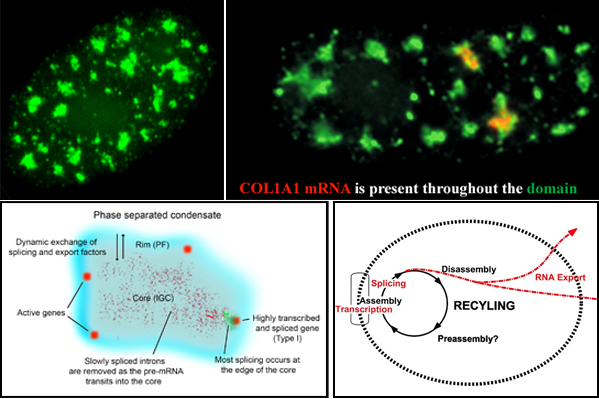 Nuclear speckles, also referred to as SC-35 domains, are nuclear structures that are enriched with factors involved in transcription, RNA processing and export, as well as ncRNAS such snRNAs and the lncRNA MALAT1 (also called NEAT2). Specific genes localize at the edge of speckles, and the concept that they are hubs for transcription, mRNA processing and export has been suggested by our lab since the mid-1990s. Now, genome wide studies have found that active genes throughout the genome associate with speckles. Speckles (top left image) are membraneless condensates that facilitate expression of associated genes through increased concentration and dynamic exchange of factors involved in mRNA metabolism. Top right image: Some speckles have Col1A1 RNA throutout them. Lower left model: Many active genes (red) position in the rim (blue region), which corresponds to perichromatin fibril (PF) ultrastructures, where transcription occurs, but are adjacent to the speckle core (corresponding to interchromatin granule cluster (IGC) ultrastructures), which contains transcription, splicing and export factors. All or almost all introns (green) are removed within the periphery at or near the gene, while some introns can be such as slow splicing introns of COL1A1 mRNA (punctate red signals) distribute throughout the core. Highly expressed, intron-rich genes such as Col1A1 always associate with speckles and their nascent mRNAs can be found within the speckle. We propose that these high demand genes nucleate formation of speckles with which other genes then associate to facilitate their own expression.Lower right: Model suggesting a functional rationale for coupling the completion of mRNA maturation and release for mRNA export with the recycling/preassembly of factors within speckles. Since pre-mRNA processing requires interaction of many different factors, their concentration in condensates would facilitate recycling and reuse for expression of adjacent genes. Selected Lawrence lab publications about SC-35 speckles: Molecular anatomy of a speckle. Anat Rec A Discov Mol Cell Evol Biol. 2006 Jul;288(7):664-75. A three-dimensional view of precursor messenger RNA metabolism within the mammalian nucleus. Science. 1993 Feb 26;259(5099):1330-5. |