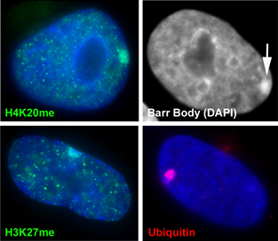 The inactive chromosome exhibits numerous epigenetic hallmarks. For example, methylation of histones H4K20 and H3K27, H2AK119 ubiquitination and condensation into a compact structure called the Barr body that stains densely with the DNA stain DAPI.