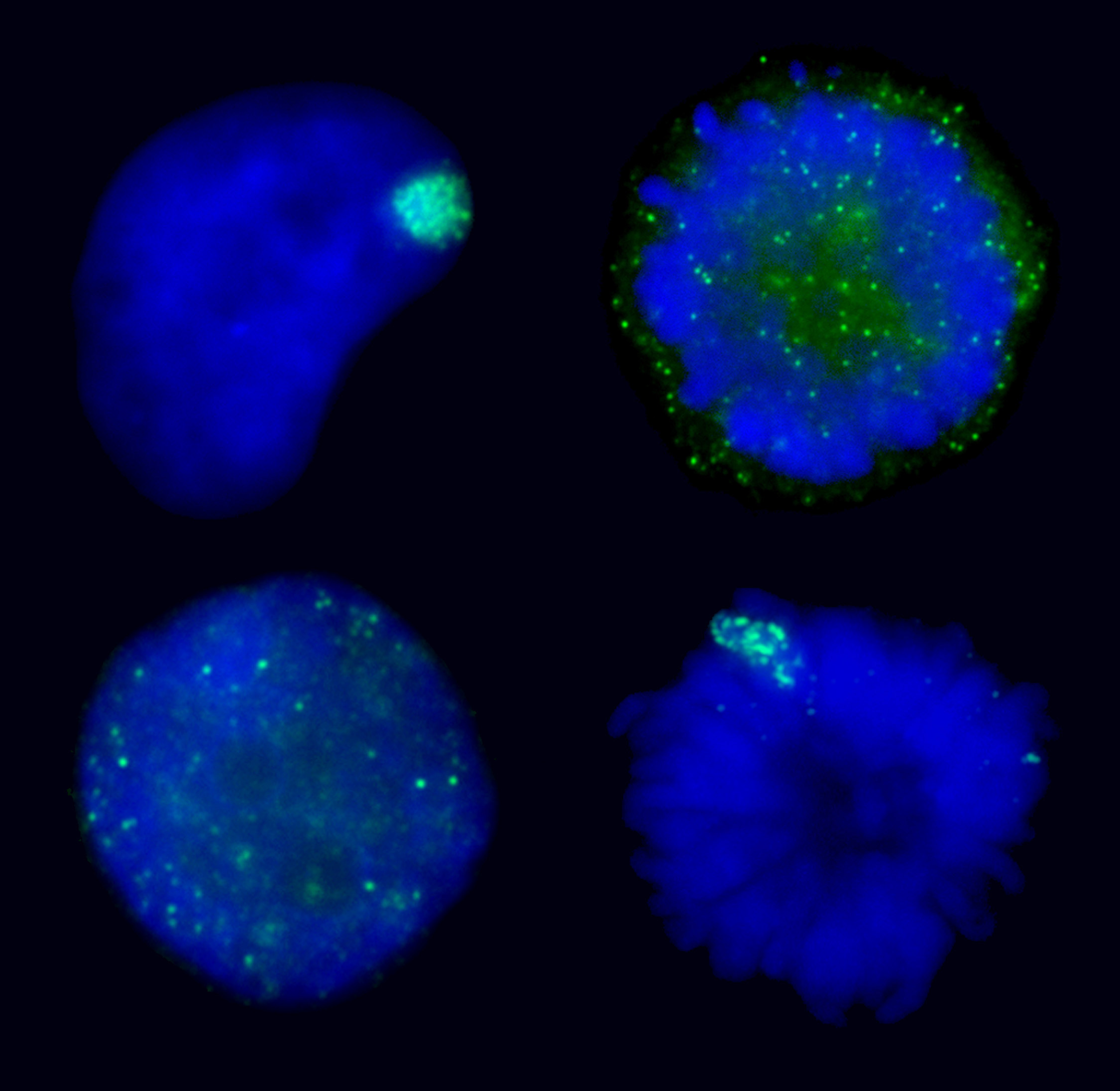 Xist RNA Panel XIST RNA (green in left image) paints the inactive X-chromosome in interphase human female cells.
