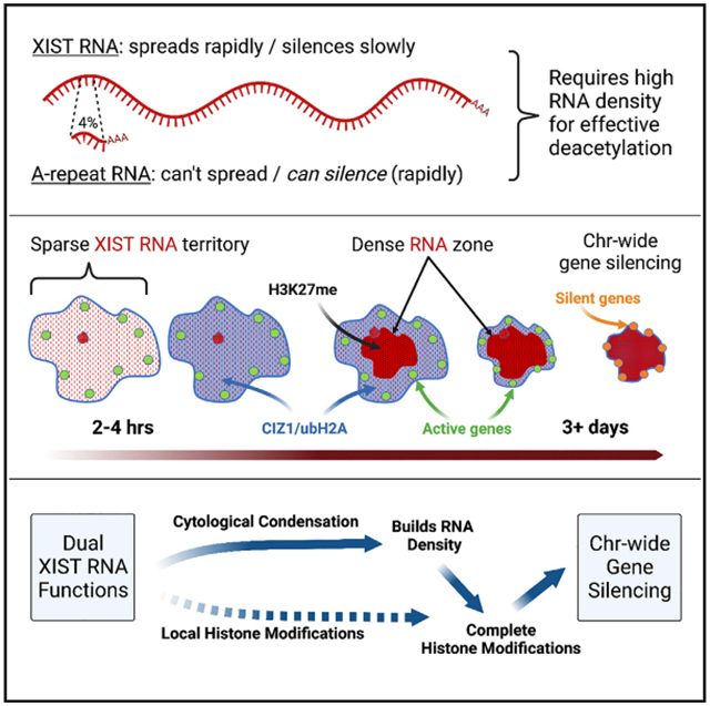 Early chromosome condensation by XIST builds A-repeat RNA density that facilitates gene silencing. Cell Rep. 2023 Jul 25;42(7):112686.