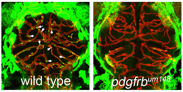 Along with the endothelial cells that line blood vessels, mural cells play an essential role in the function of the circulatory system. Mural cells include vessel-associated cell types such as pericytes and vascular smooth muscles. Pericytes are associated with capillaries and provide important barrier function in the nervous system, where they comprise the blood brain barrier together with endothelial cells and astrocytes. Vascular smooth muscle (VSMC) are found predominantly on larger caliber arteries where they provide strength and elasticity. In the zebrafish, we are able to directly visualize both of these cell types with transgenes driving fluorescent proteins.