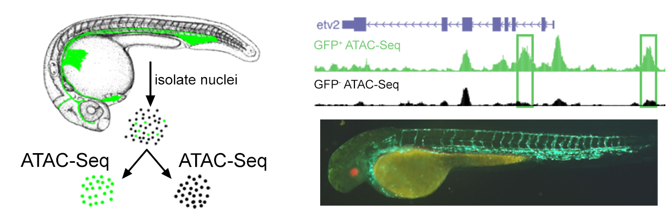 In the Lawson Lab, we strive to develop and apply cutting edge technologies to address our questions of interest. Among our efforts include generation of the first zebrafish knockouts using programmable nucleases. Our subsequent large-scale efforts to apply this technology led us to discover major discrepancies between the use of antisense knockdown technologies (e.g. Morpholinos) and bona fide genetic approaches. We have also developed a collection of Gateway compatible plasmids for analyzing gene function in zebrafish, which are widely used in the community. More recently, we have applied techniques, such as FANS-assisted ATAC-Seq, to dissect transcriptional regulation of vascular development. In addition we use a variety of approaches amenable to zebrafish, including two-photon time-lapse microscopy, to directly visualize and manipulate blood vessel growth (for examples, see here and here).