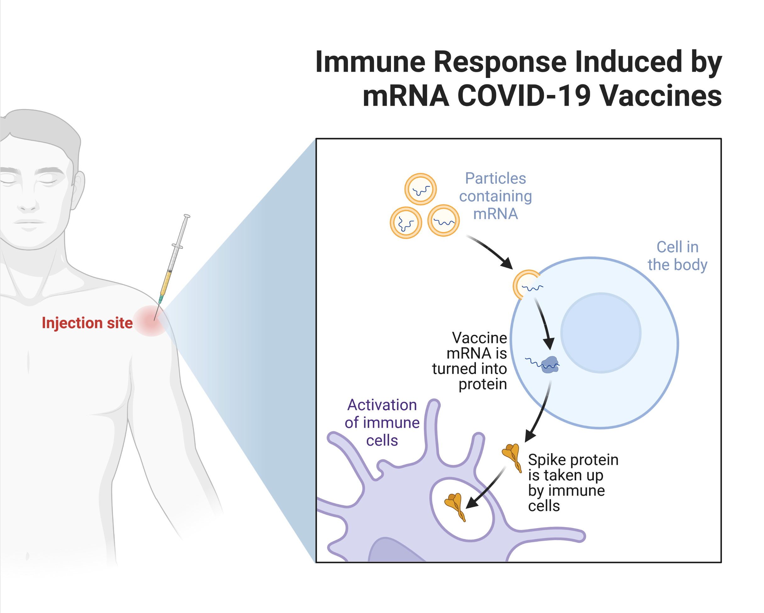 Pfizer and Moderna both use messenger RNA from the COVID-19 virus to give our cells instructions to make a piece of the virus - in this case, the spike protein. After getting vaccinated, our bodies recognize that the protein shouldn’t be there. In response, our immune system starts making antibodies, which are proteins that bind to the virus to prevent an infection. Our bodies also build memory cells that remember how to fight COVID-19 if we get infected. High antibody levels can neutralize the virus and protect against infection. Unfortunately, after a few months, antibody production decreases. Boosters can bump up antibody production so that we stay protected!