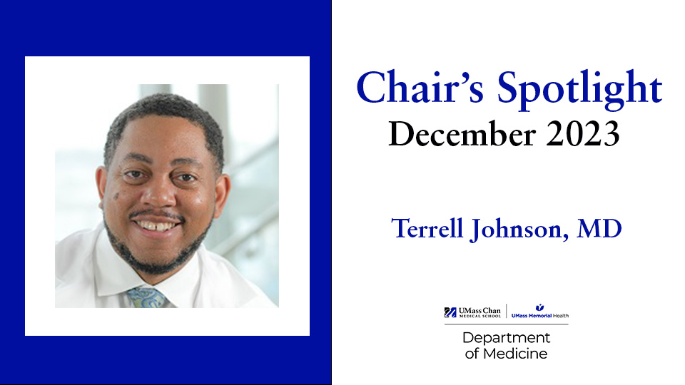 In this month’s Chair’s Spotlight, we highlight Terrell Johnson, MD, a physician in the Division of General Internal Medicine, and co-director of Diversity, Inclusion, and Social Justice in the Department of Medicine. He joined UMass Chan Medical School/UMass Memorial Health this past August and has enthusiastically dived into a variety of activities across Medicine’s mission areas. In November, we spoke with Dr. Johnson to learn more about what led him to become a physician, what his hopes are as he embarks on a new chapter of his career at UMass, and why addressing the importance of diversity and equity in medicine is of critical importance.