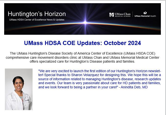 The UMass Huntington's Disease Society of America Center of Excellence (UMass HSDA COE) at the UMass Neurology Clinic has launched Huntington’s Horizon, a newsletter featuring UMass HSDA COE news, updates and referral process. Please reach out to jennifer.gomez@umassmemorial.org if you are interested in referring a patient to the clinic. Click here if you would like to subscribe to receive our newsletter.