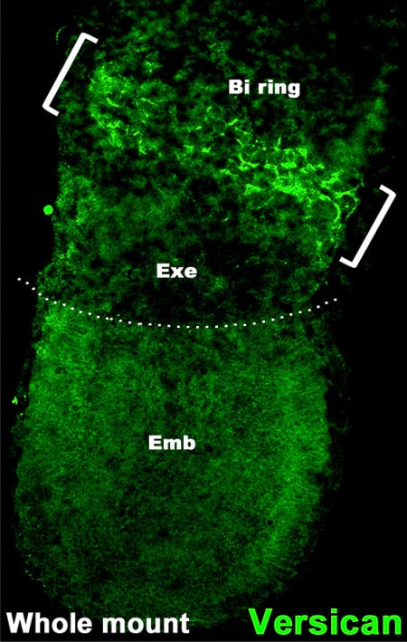 Intriguingly, loss of versican leads to a complete loss of hyaluronan (HA) in versican KO mouse embryos and loss of HA in Has1+2+3 triple KO or Has2 single KO mouse embryos alone also leads to versican catabolism. Loss of HA in versican KO embryos and cell lines seems to be mediated through up regulation and activation of TMEM2, a major extracellular hyaluronidase. In future research we will continue to study the molecular mechanism of this crucial ECM niche in embryonic tissues as well as its presence and importance in adult diseases and angiogenesis.