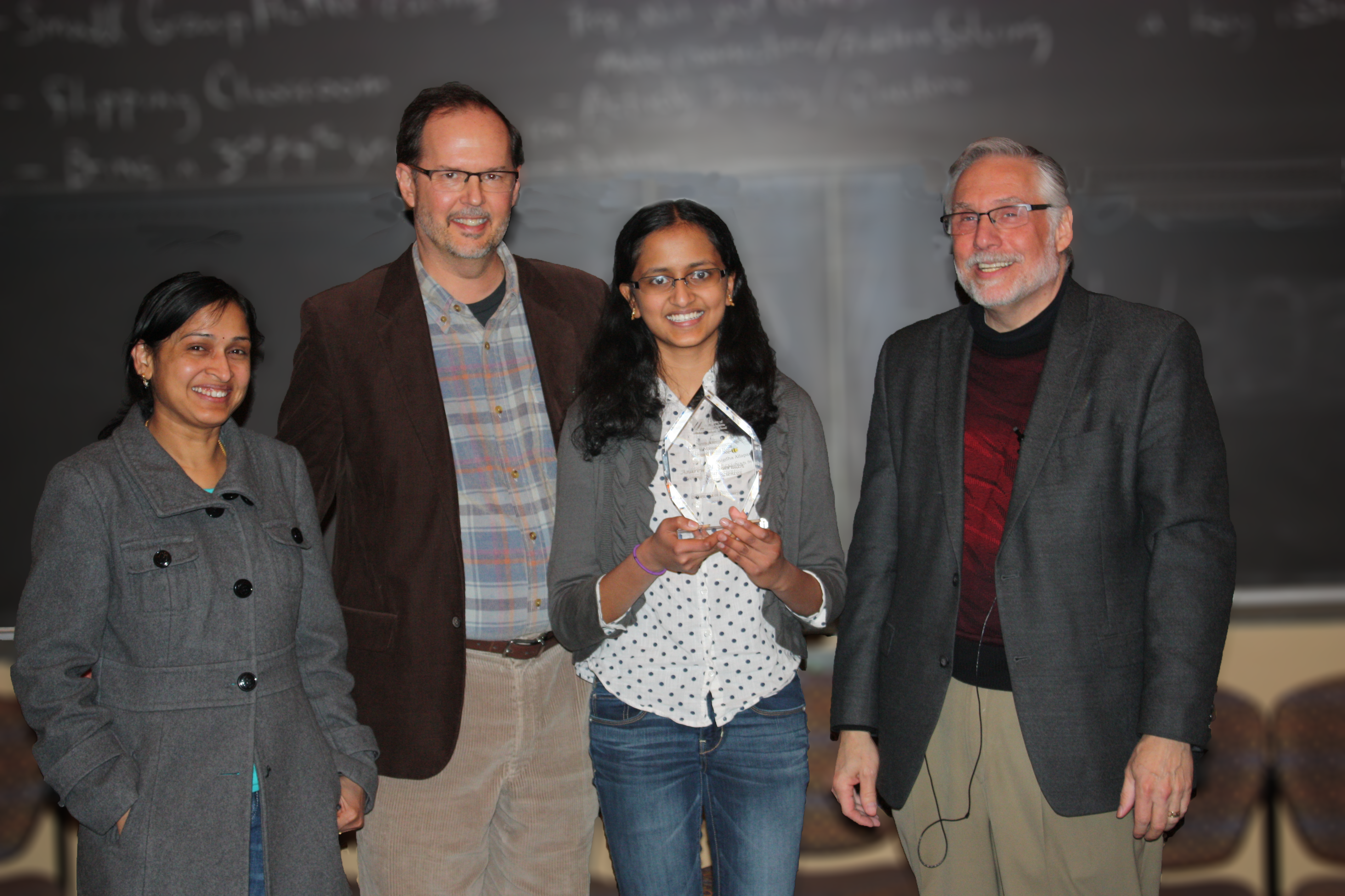 | The 2015 Central MA Regional Brain Bee winner, Snigdha Allaparthi, is pictured here along with her mother, Sailaja Allaparthi, Dr. Douglas Ziedonis, and Dr. Sheldon Benjamin. |