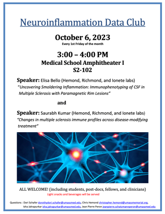 Neuroinflammation Data Club: meets the first week of the month at UMass Chan ampitheater, S2-102 from 3 pm to 4 pm.
