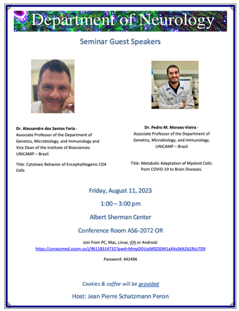 Dr. Alessandro Santos Faria, associate professor of the Department of Genetics, Microbiology, and Immunology, Vice Dean, Institute of Biosciences at UNICAMP, Brazil. Seminar Title: Cytotoxic Behavior of Encephalitogenic CD4 Cells