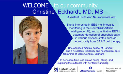 Christine Eckhardt, MD, MS, assistant professor of neurology, joins the Neurocritical Care team in the department of neurology. Originally from New Jersey, she has lived in Massachusetts for over 20 years. After undergraduate and medical school at Harvard, she completed neurology residency and neurocritical care fellowship at Mass General Hospital Brigham.