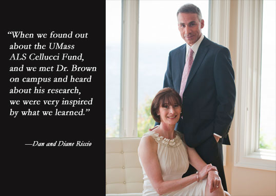 “We always knew that someday we would give back to UMass,” said Diane Riccio. Dan Riccio is also an alumnus of UMass, graduating from the Amherst campus in 1986 with a bachelor’s degree in mechanical engineering. “When we found out about the UMass ALS Cellucci Fund, and we met Dr. Brown on campus and heard about his research, we were very inspired by what we learned.”