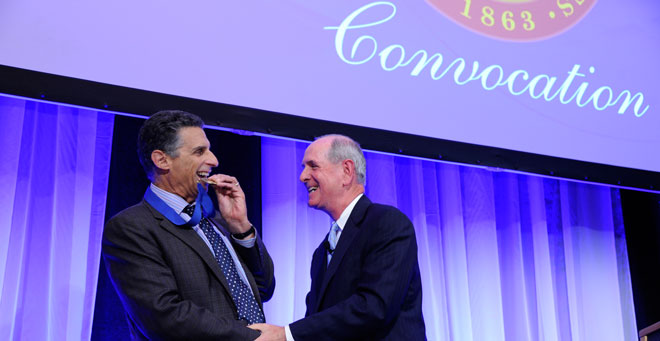 In the face of deep cuts to the federal funding that supports the UMass Worcester research enterprise, Chancellor Michael F. Collins called on the campus community to take a “leap of faith” by pressing forward and continuing to excel in the academic health sciences. In his annual Convocation address, Chancellor Collins pointed to the overwhelming success of the “Ice Bucket Challenge” social media campaign for ALS research as evidence of what can be accomplished when people work together.