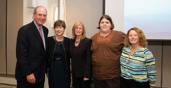 (from left) Chancellor Collins presented the 2015 Chancellor’s Award for Advancing the UMMS Mission to Work Without Limits Employer Engagement Team members Alexis Henry, ScD, Kathy Petkauskos, Megan Northup and Kathy Muhr. |