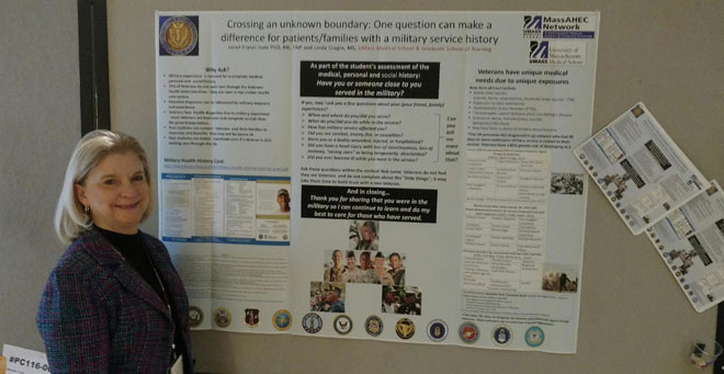 UMass Medical School veterans health experts Janet Hale, PhD, and Linda Cragin, MS, were honored for providing valuable information to nurse practitioners in training, many of whom will serve on the front lines of primary care, about why health care providers should ask patients if they or someone close to them has served in the military.
