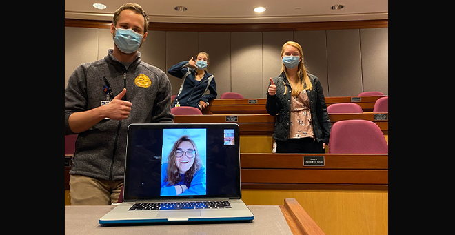 From left, SOM students Calvin Schaffer, Elya Reznichenko, Olivia Sears and Emma Cammann (on computer screen) prepare to teach clinic staff how to use telehealth services. |