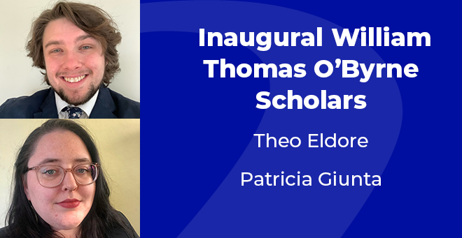 Second-year School of Medicine students Theo Eldore and Patricia Giunta were chosen as the inaugural William Thomas O’Byrne Scholars, Collins said.