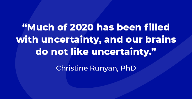 “I have come to conceptualize a lot of what is happening in COVID as a disruption in our nervous system,” Dr. Runyan said. “The mind-body connection is actually quite sensitive to both what is real and what is imagined. So much of 2020 has been filled with uncertainty, and our brains do not like uncertainty.”