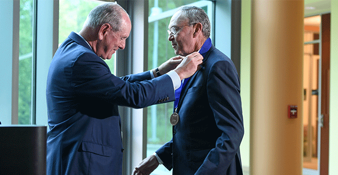 Mark Klempner, MD, executive vice chancellor for MassBiologics of UMass Medical School and professor of medicine, was recognized by Chancellor Michael F. Collins with a Chancellor’s Medal to honor his outstanding leadership as he prepares to step down from the top post.