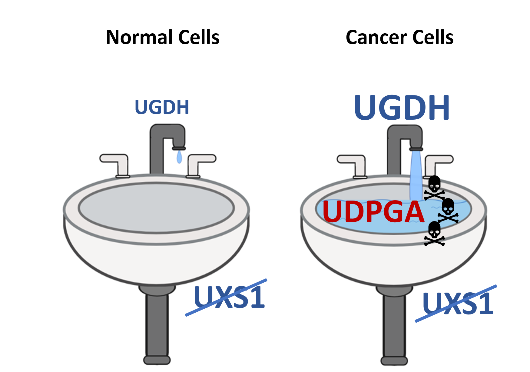 “It’s like clogging a drain,” said Kim. “The faucet is the upstream metabolic enzyme (UGDH) producing the toxic metabolite (UGPDA), and the drain is the detoxifying enzyme (UXSI). In cancer cells, the faucet is gushing toxic levels of metabolites, but in healthy noncancer cells, the faucet is barely dripping. By inhibiting the detoxifying enzyme, we’re clogging the pipes that drain the toxic metabolite, allowing the metabolite to accumulate to dangerous levels in cancer cells. But because the faucet is barely on in normal cells, they remain unaffected, and healthy.”