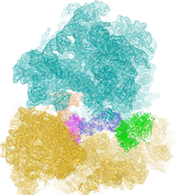 Using the latest cryo-EM technology, Korostelev and Loveland were investigating the structure of the ribosome when they began observing an unidentified protein in a ribosome sample that they obtained from their collaborators in the laboratory of Allan Jacobson, PhD, chair emeritus and professor of microbiology & physiological systems at UMass Chan. Cryo-EM is a type of electron microscopy that uses cryogenic temperatures to freeze cell samples and hit them with an electron beam. As electrons pass through the cell samples, images are captured that can be reconstructed into a high-resolution 3D model. An indispensable tool for studying the structures of biological molecules, cryo-EM allows scientists to observe the structure of biological molecules at an exceptional level of detail.