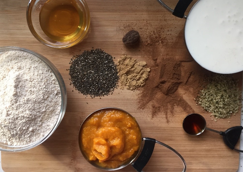 1. Whisk kefir, pumpkin, egg, oil, vanilla, and honey in a large mixing bowl.